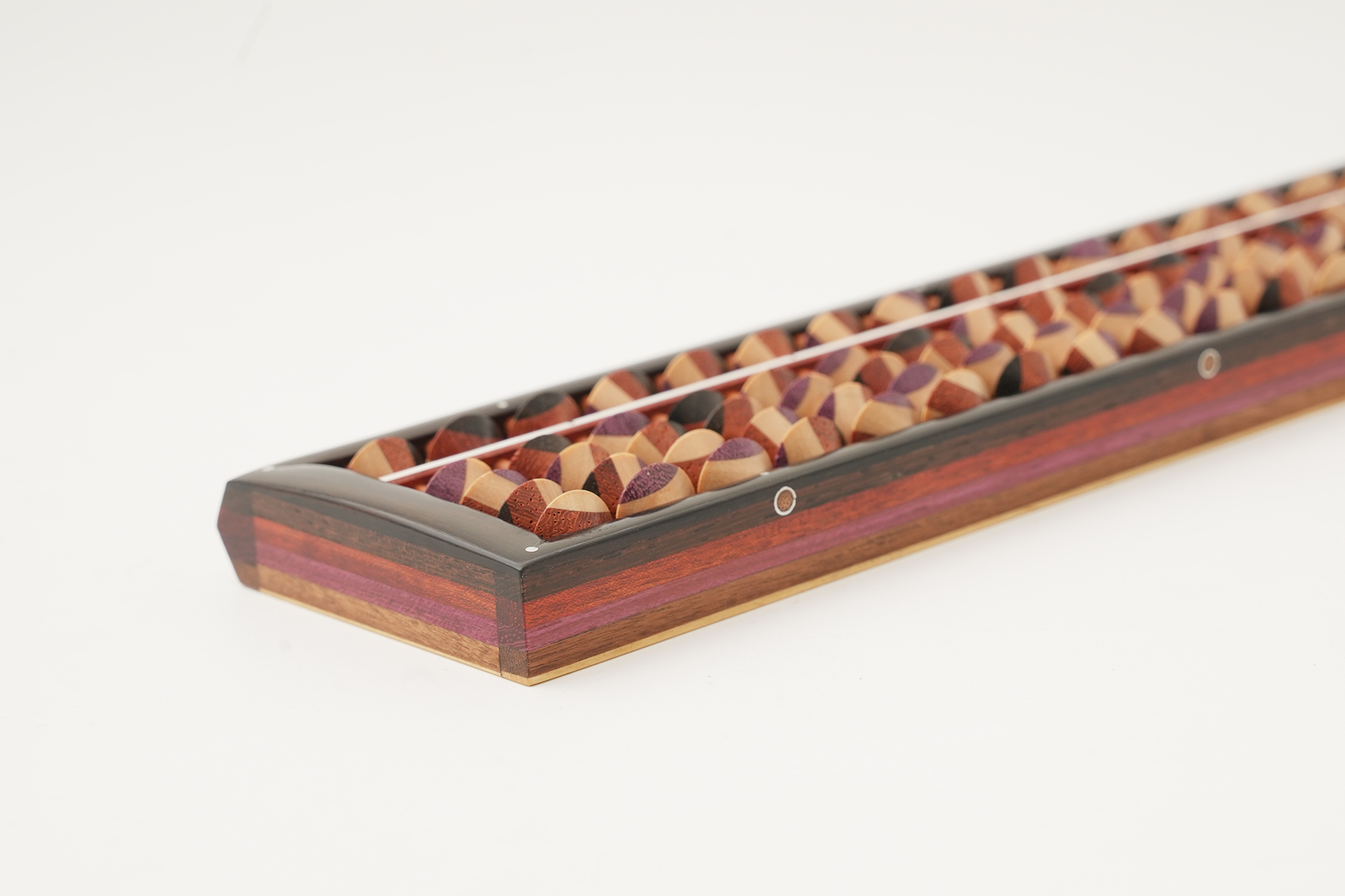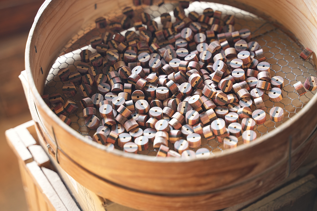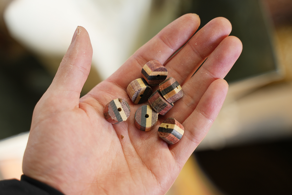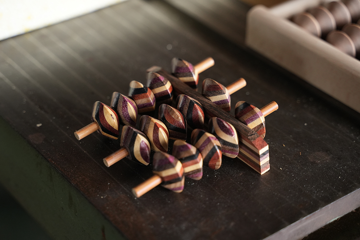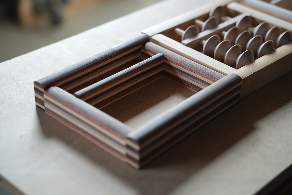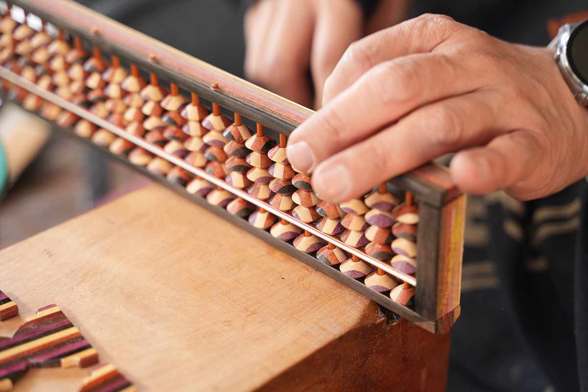 黒檀・アフリカ紫檀などの寄木唐木材で玉材を作ることに挑戦し、枠材を3ミリの厚みにカットし、色合わせの組み方を考え、締め金具などを使い寄木材を作成した。玉を削るために専用特殊刃物を使い材料の抜き落とし作業行い、玉削り加工場でそろばん玉を製作した。