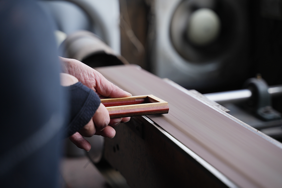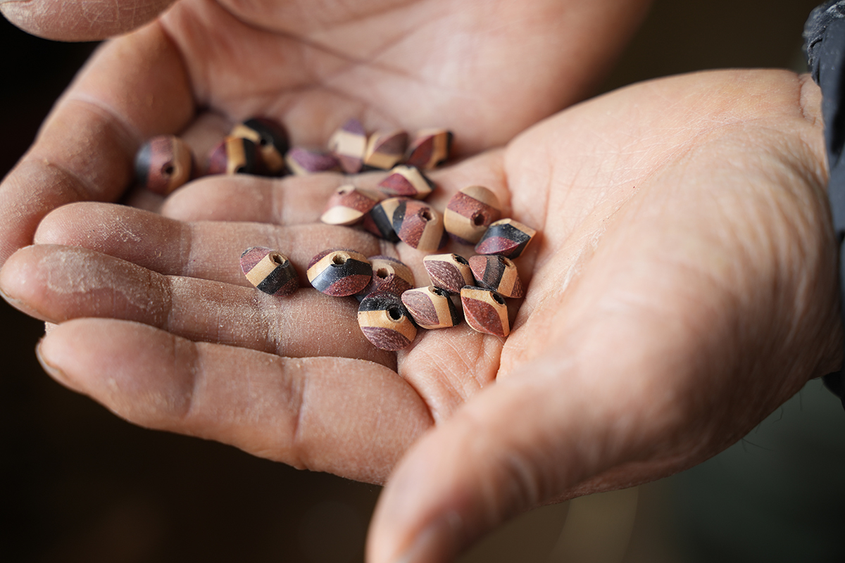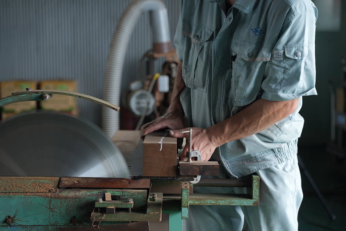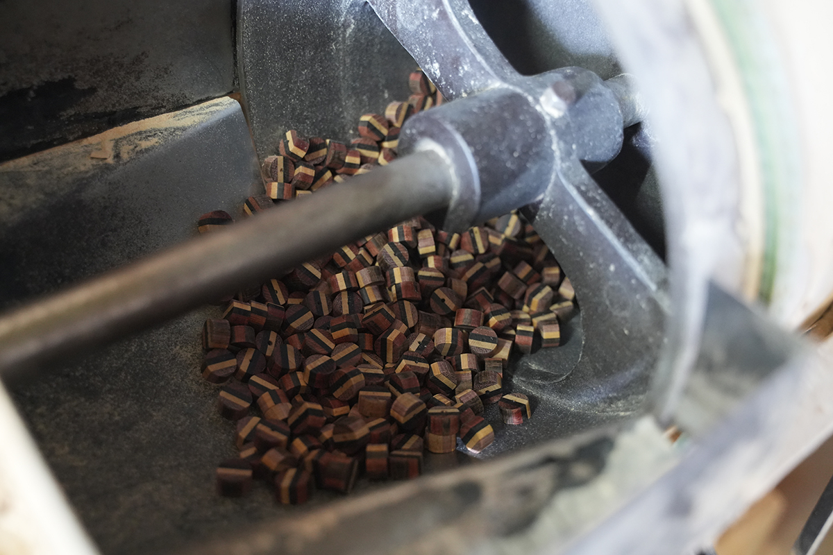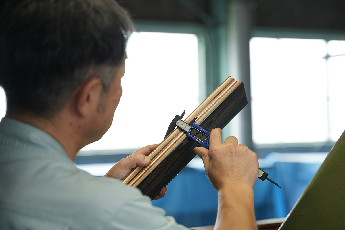 黒檀・アフリカ紫檀などの寄木唐木材で玉材を作ることに挑戦し、枠材を3ミリの厚みにカットし、色合わせの組み方を考え、締め金具などを使い寄木材を作成した。玉を削るために専用特殊刃物を使い材料の抜き落とし作業行い、玉削り加工場でそろばん玉を製作した。