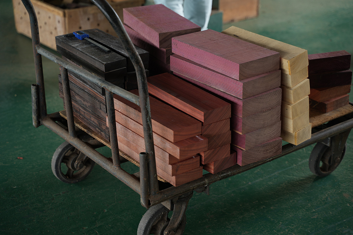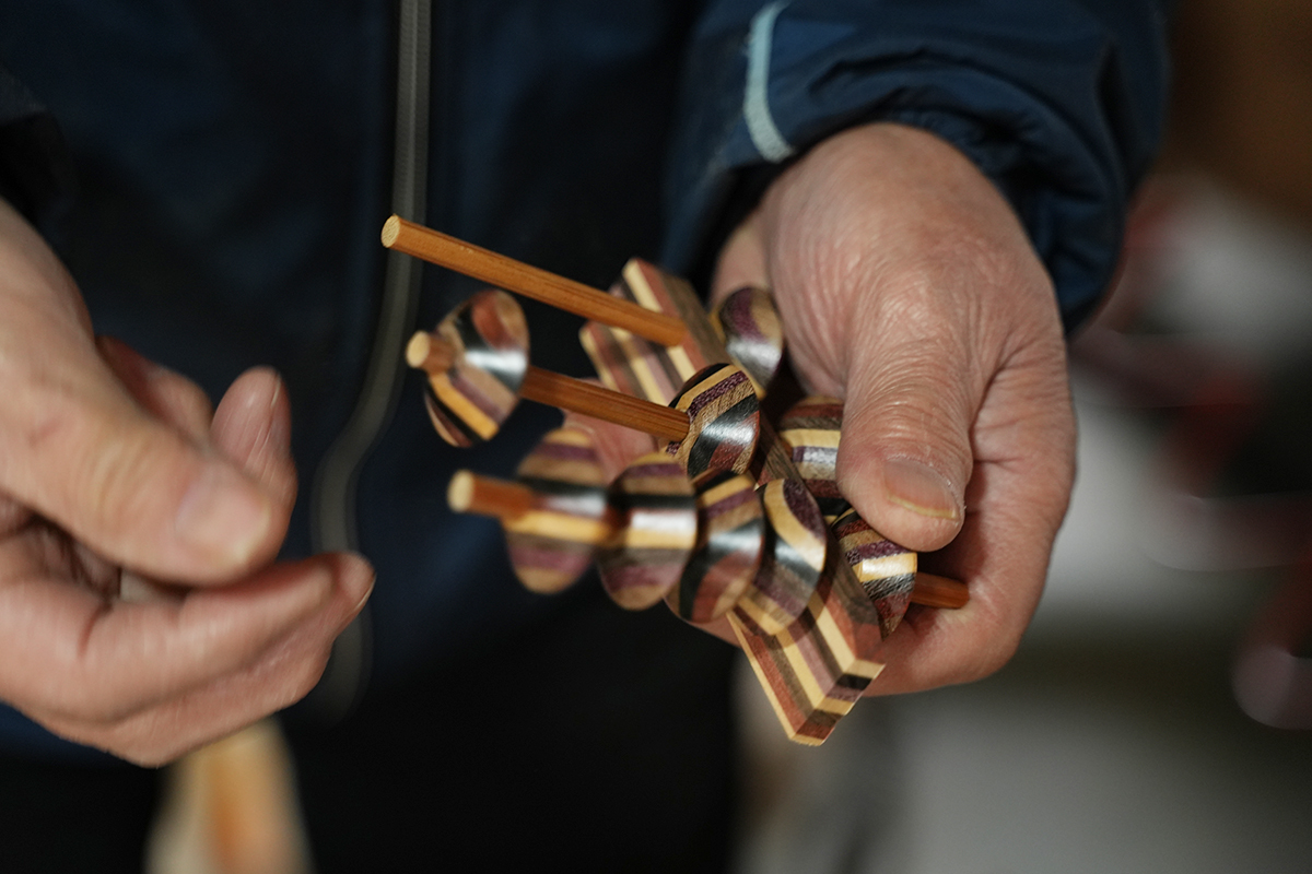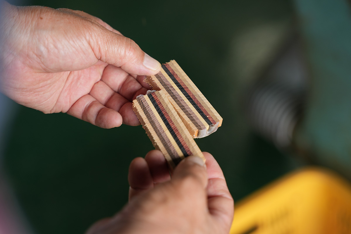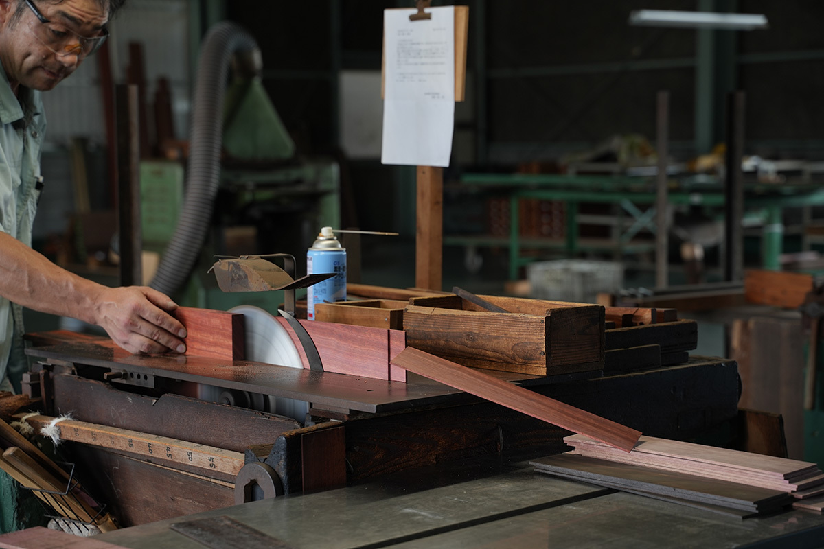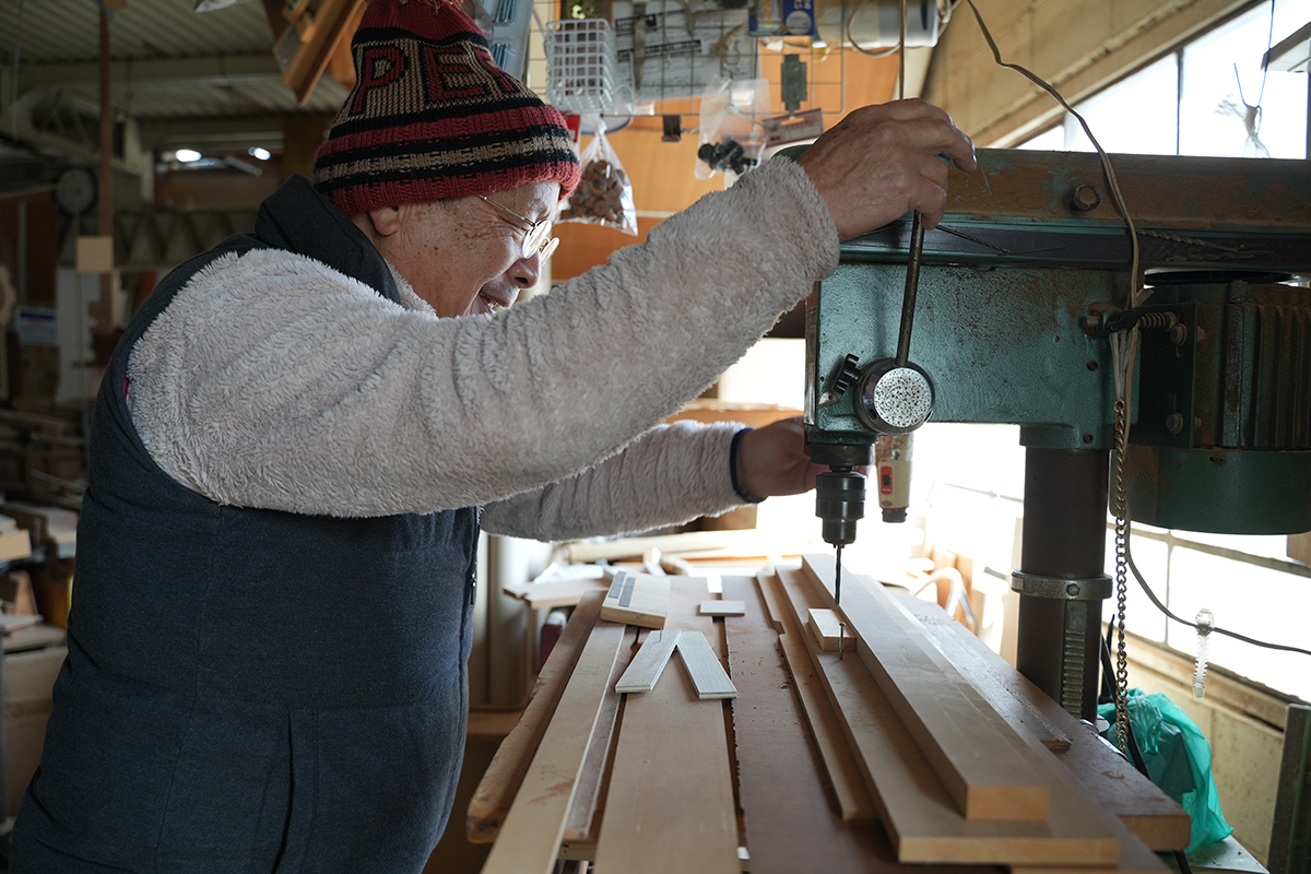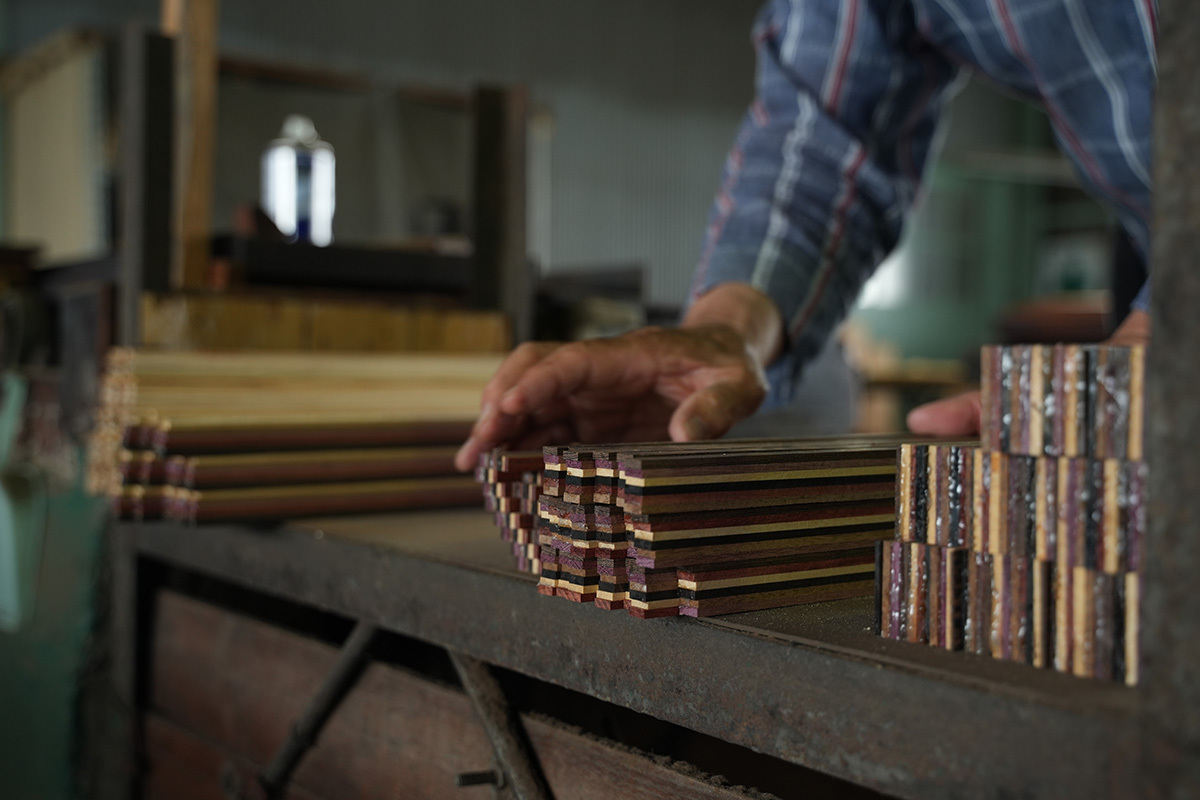 黒檀・アフリカ紫檀などの寄木唐木材で玉材を作ることに挑戦し、枠材を3ミリの厚みにカットし、色合わせの組み方を考え、締め金具などを使い寄木材を作成した。玉を削るために専用特殊刃物を使い材料の抜き落とし作業行い、玉削り加工場でそろばん玉を製作した。