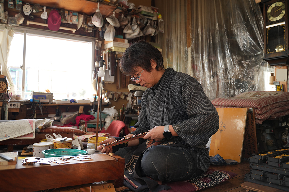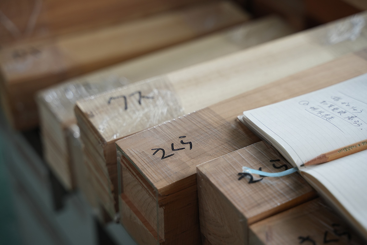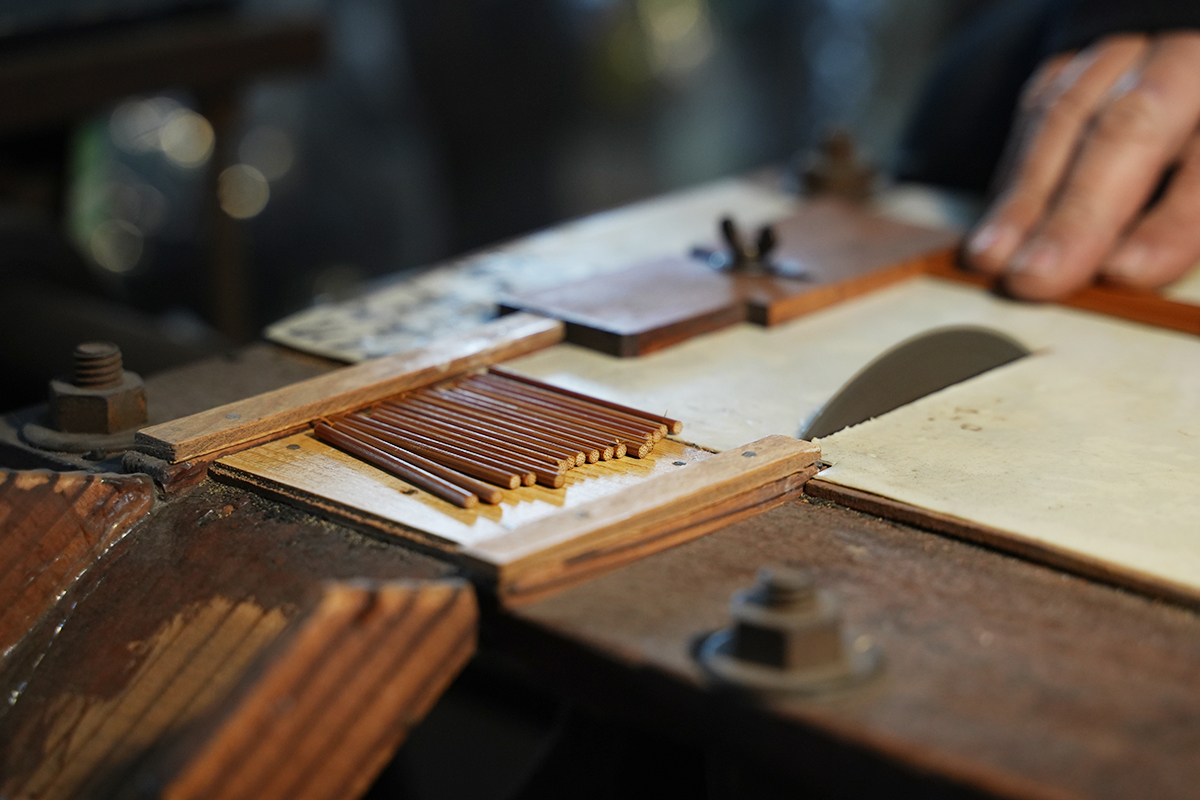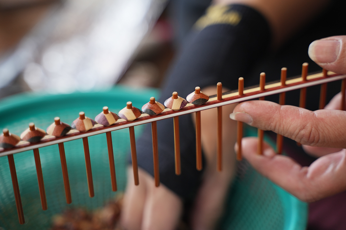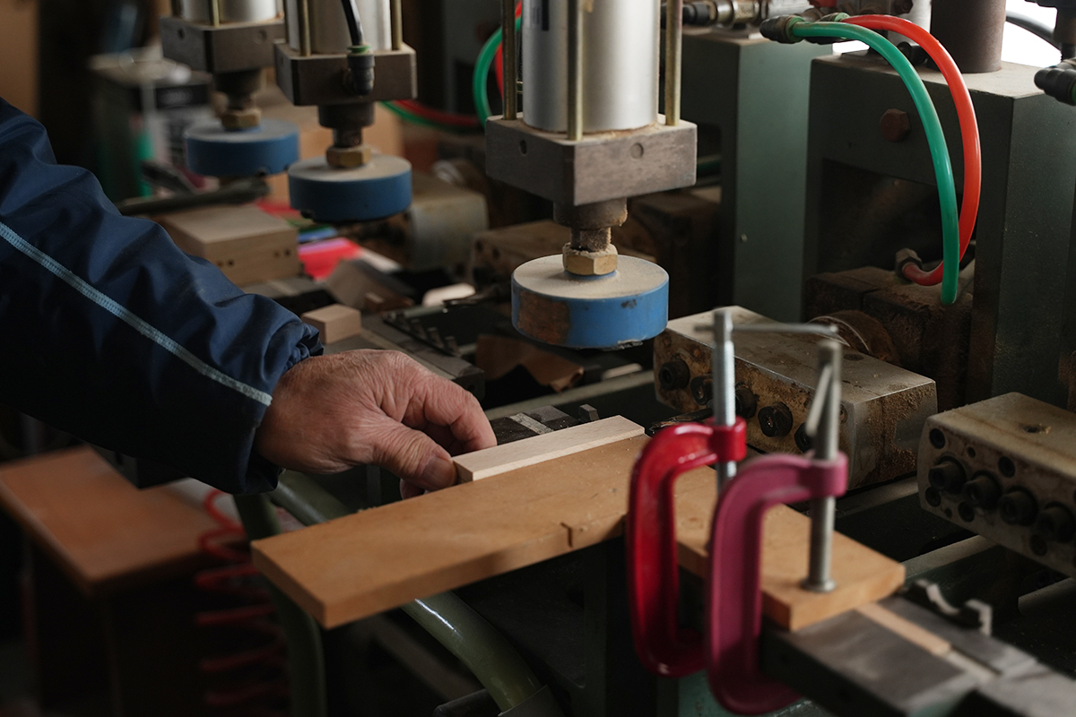 黒檀・アフリカ紫檀などの寄木唐木材で玉材を作ることに挑戦し、枠材を3ミリの厚みにカットし、色合わせの組み方を考え、締め金具などを使い寄木材を作成した。玉を削るために専用特殊刃物を使い材料の抜き落とし作業行い、玉削り加工場でそろばん玉を製作した。