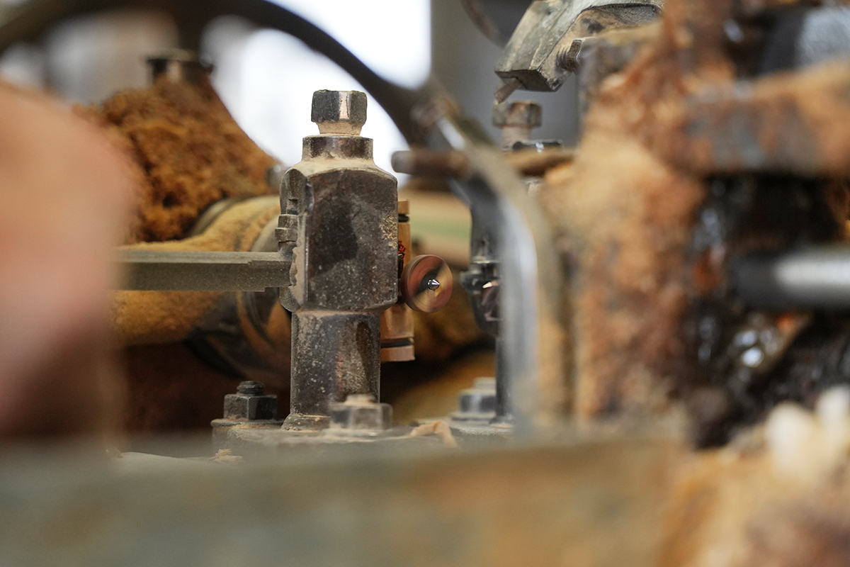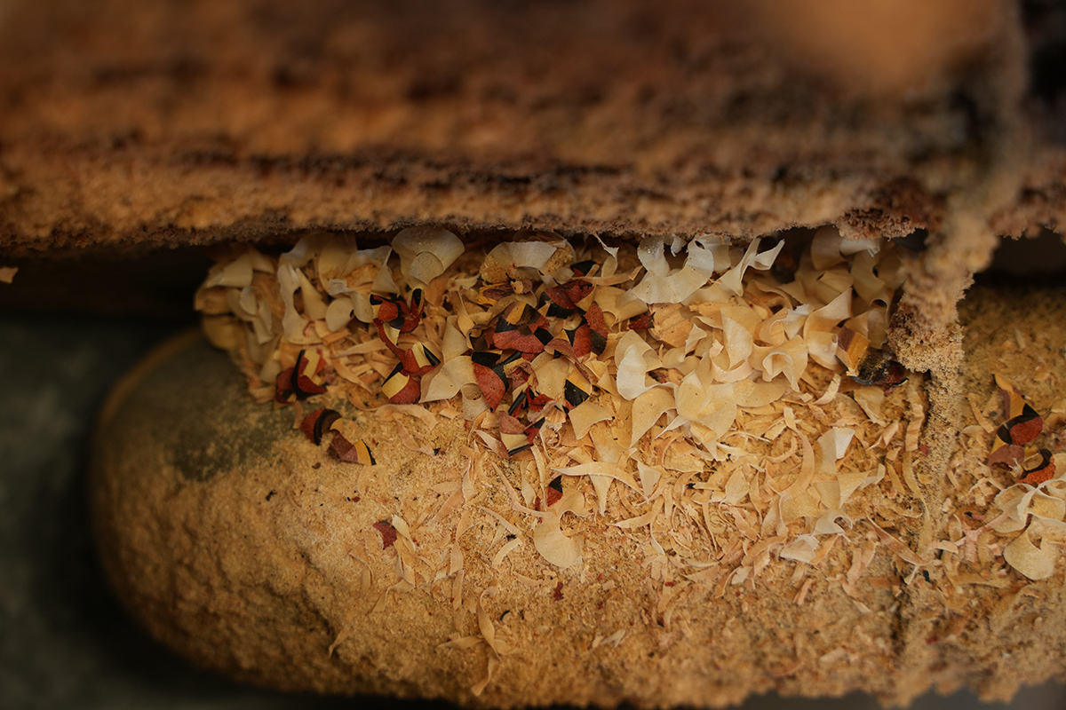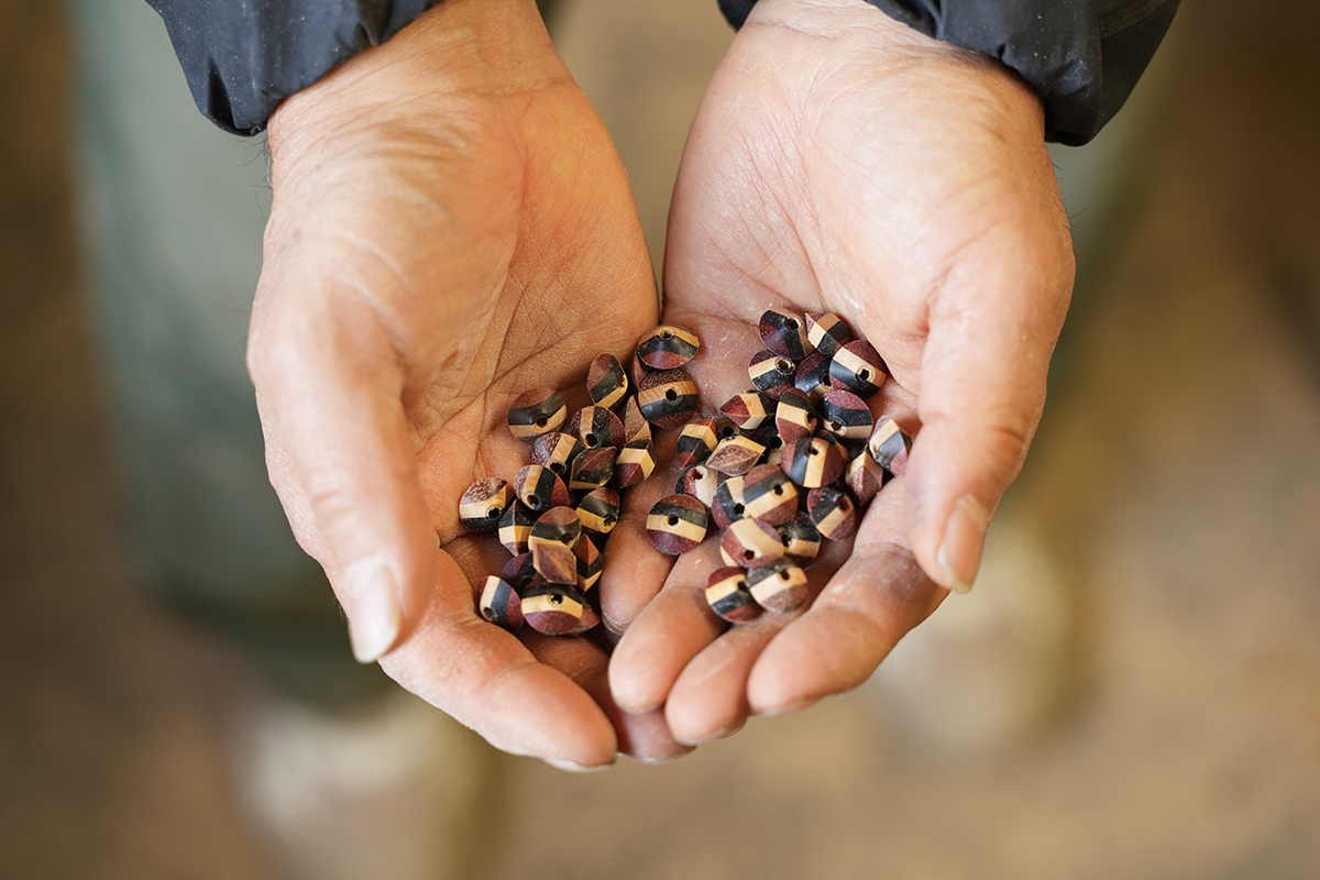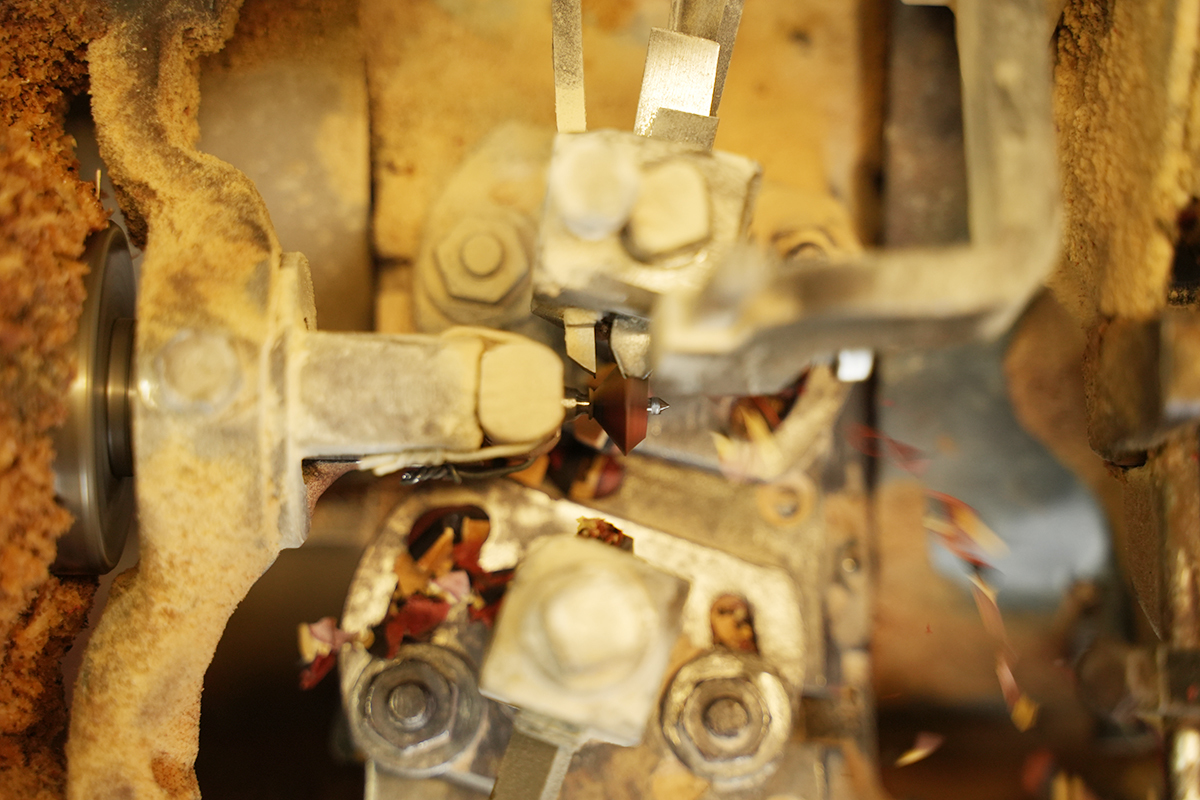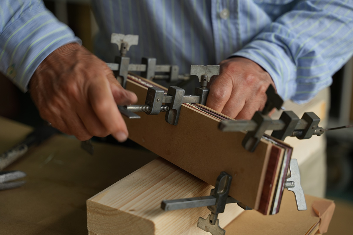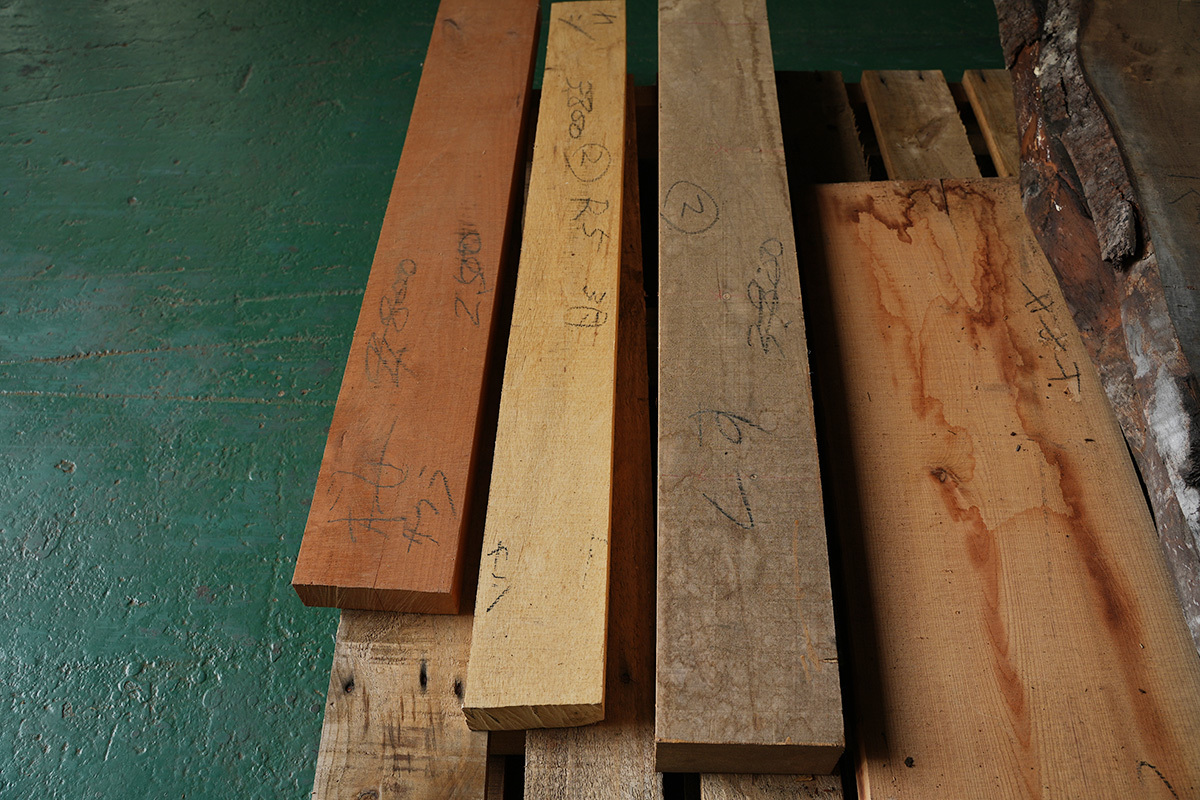 黒檀・アフリカ紫檀などの寄木唐木材で玉材を作ることに挑戦し、枠材を3ミリの厚みにカットし、色合わせの組み方を考え、締め金具などを使い寄木材を作成した。玉を削るために専用特殊刃物を使い材料の抜き落とし作業行い、玉削り加工場でそろばん玉を製作した。