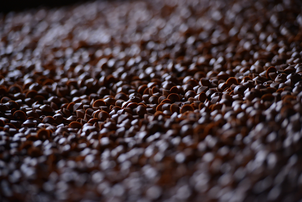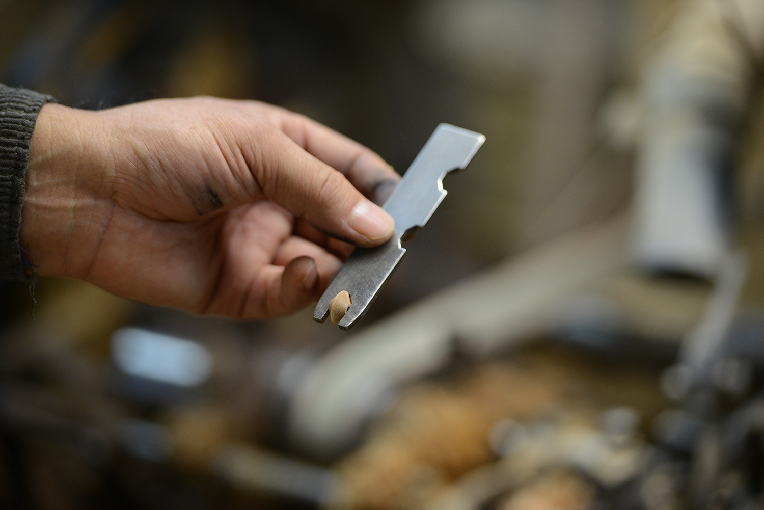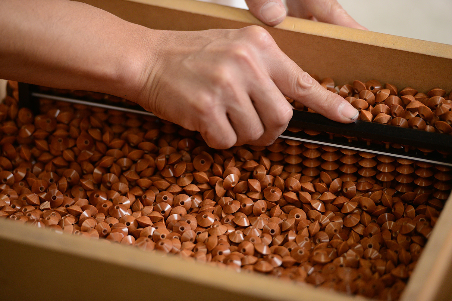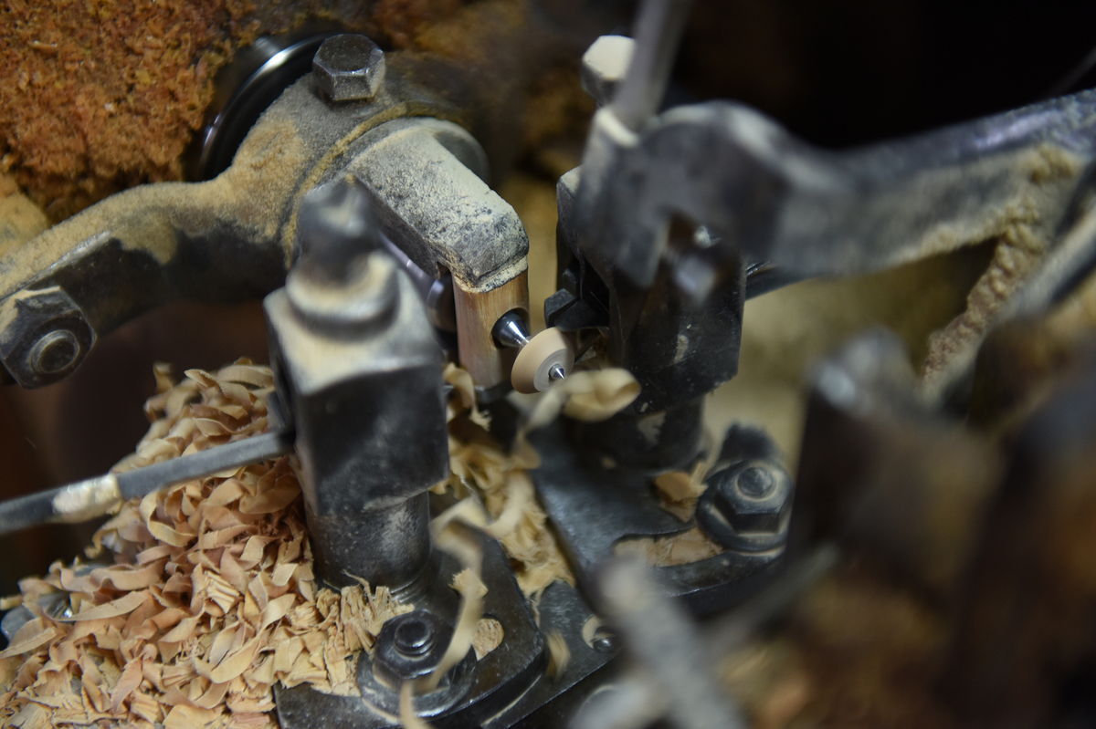 厚木を輪切りにし、丸い形に打ち抜き、さらに削って玉の形を作ります。