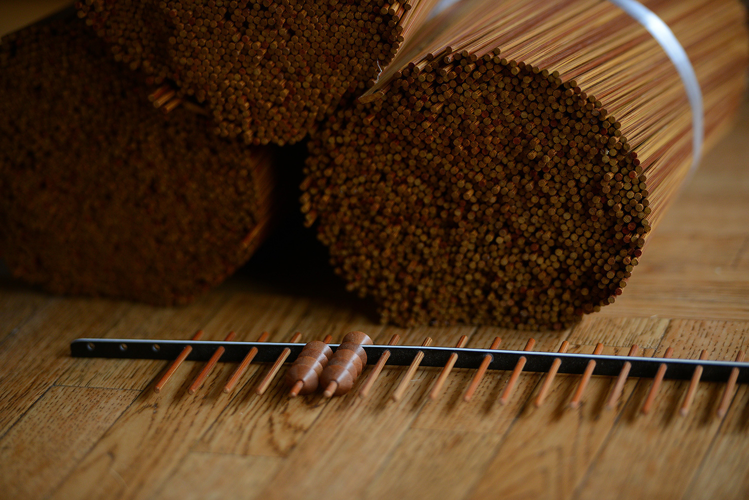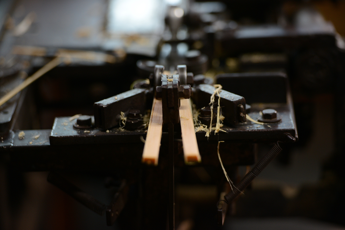 竹を寸法切りにし、小さく割って丸いひごに加工します。